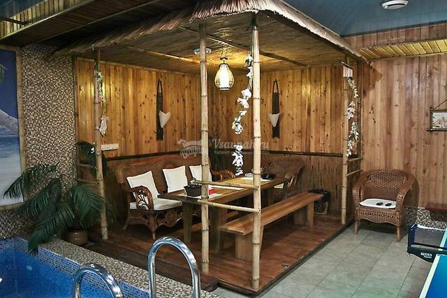 Наша сауна предлагает вам отдых в отличном и уютном месте. Вашему вниманию предлагается: Просторный зал, оформленный в тропическом стиле. Большой плазменный телевизор. Караоке для любителей попеть. Просторный бассейн 5х3 метра, оборудованный современной системой фильтрации воды, с подсветкой и возможностью подогрева. Две отдельные комнаты отдыха. Удобная дровяная парная с возможностью попариться под веничек. Бар с прохладительными напитками. Блюда кавказкой кухни. Нарды, теннис и аэрохоккей. Услуги профессионального массажиста. Стоимость посещения нашей сауны составляет 1500 рублей/ час. При посещении сауны компанией, состоящей более чем из 8 человек, каждый последующий платит всего лишь 200 рублей/ час с человека. Для постоянных клиентов действует скидка в размере 10% от стоимости посещения.
